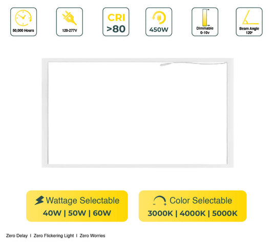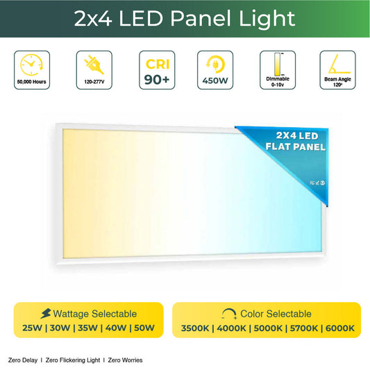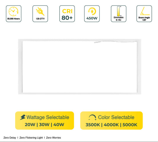 2x4 LED Panel 6500 Lumens, Adjustable Wattage 25W-50W, Selectable CCT 3500K-6500K