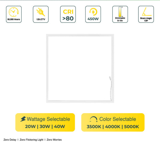 2x2 LED Panel 5200 Lumens, Adjustable 20W-40W, Selectable CCT 3500K-6500K