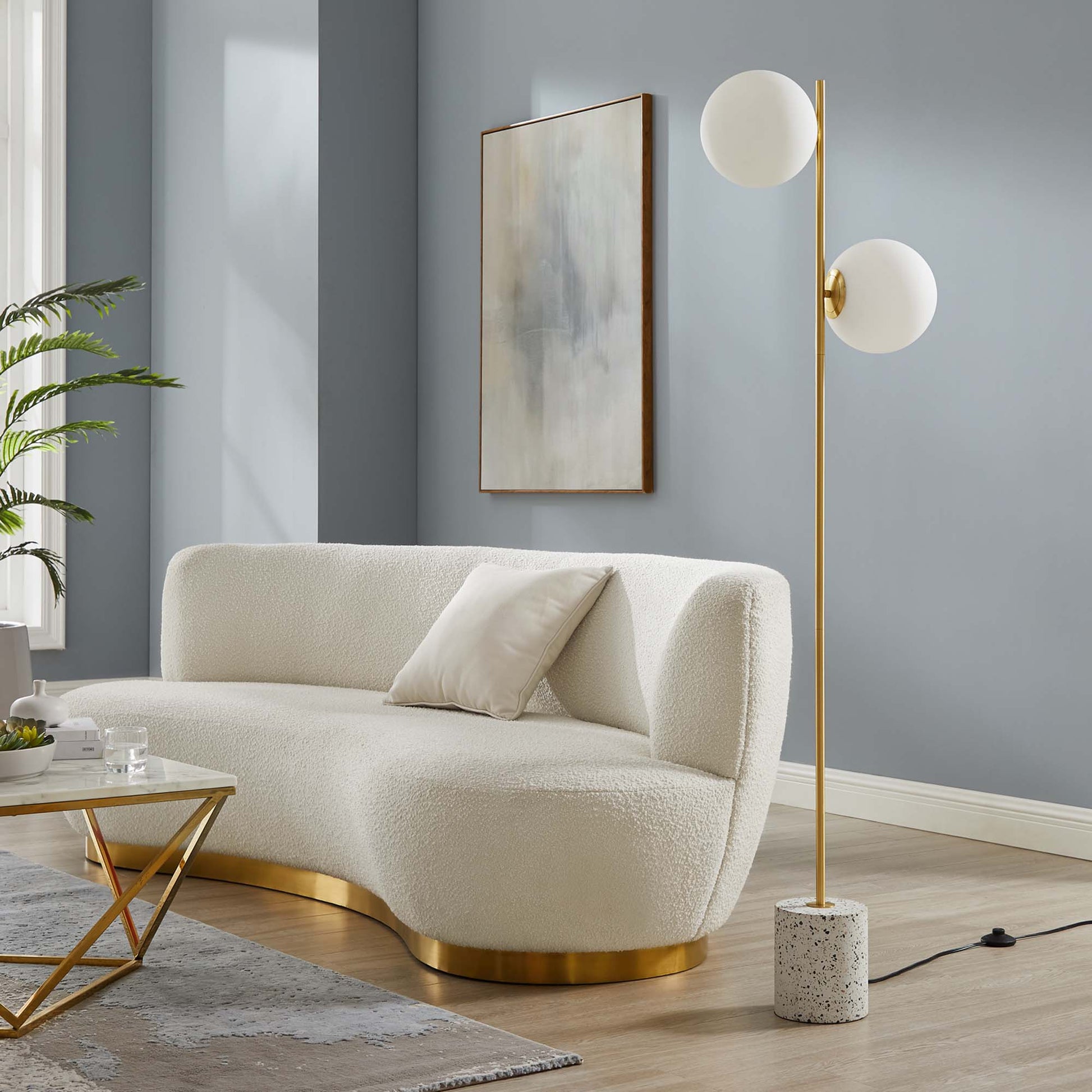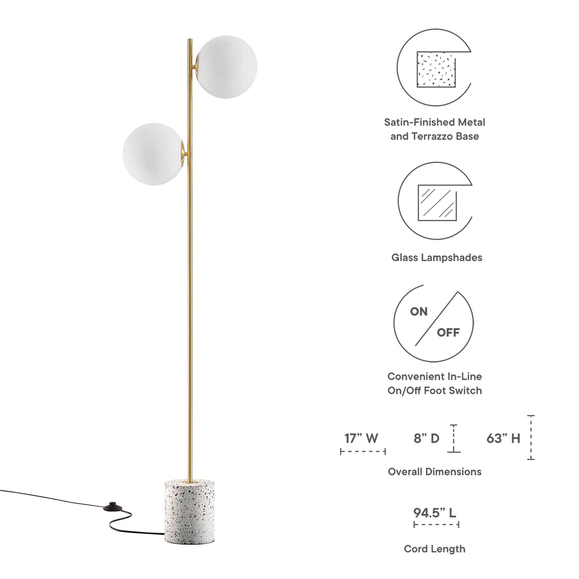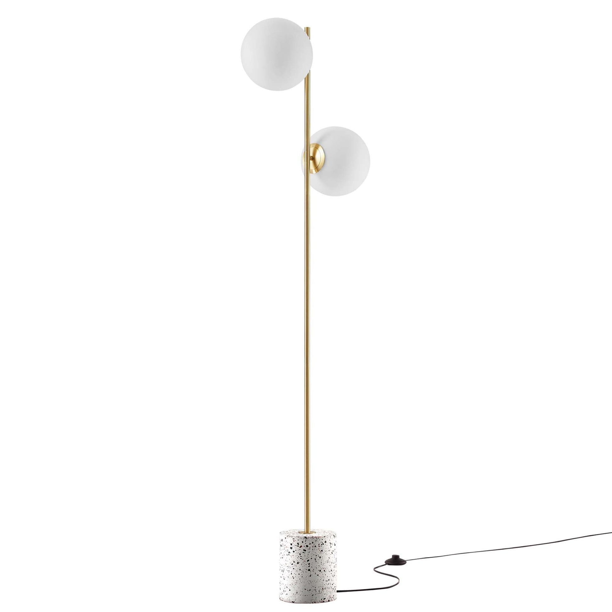 Bring intrigue into your home ambient lighting with the Logic Terrazzo Floor Lamp in your bedroom, living room, office, or study. This tall standing lamp dispenses a tranquil aura complementing mid-century modern, contemporary, or eclectic decors. A captivating floor lamp for the living room, Logic illuminates with an opaque glass globe shade resting on a satin brass rod rising from a smooth terrazzo column base. This sculpted reading floor lamp has a black power cord with a convenient on/off switch. A modern floor lamp, Logic takes 1 G45 E12 40W max bulb or LED equivalent (not included). Compatible with dimmer switches (not included). Assembly required. Clean with a soft, damp cloth.